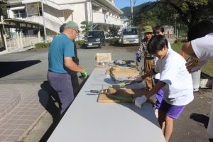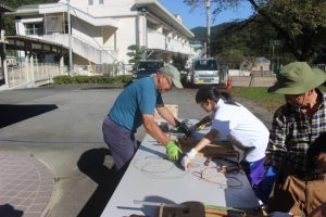 昨日3年生の卒業制作に向けた取組,輪かんじきづくりが行われました。10月初めに行ったふれあい豊な森整備事業で集めたヒノキの枝を材料に,芦安地区で作られ使われていた『芦安の輪かんじき』を芦安FCの講師の説明を聞きながら,枝を曲げ,針金で止めて形にするところまでを行いました。作業では「力の入れ方に慣れるまでが大変だった」と感想に。次回は来月,完成を目指して細かい作業が加わり行われる予定です!