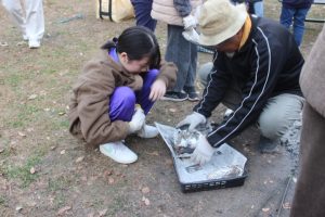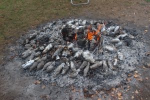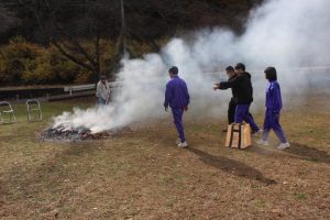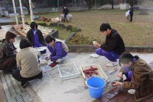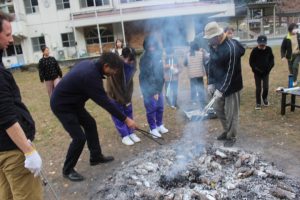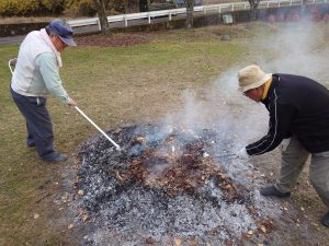 ◇10月に行ったふれあい豊かな森整備事業で伐採した枝や校舎周辺から集めた落ち葉を使い,焼き芋体験が中学校校庭で行われました。農園サポーターの功刀,高橋,米倉3名の講師が早朝から中心となり,いもを焼くための『熾火, (おきび)』を何時間もかけて作っていただきました。児童生徒は昼頃に,農園で収穫した芋をホイルに包んで熾火に入れました。放課後,小中学生が熱々の焼き芋を手に,満面の笑みでおいしそうに味わっていました!
