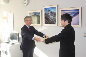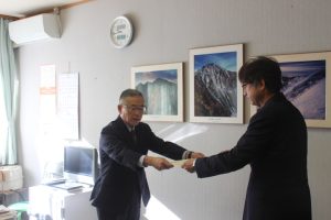 本日甲府税務署の代表者2名が来校し,『中学生 ,税についての作文』の表彰を行っていただきました。3年生には「優秀賞」が,本校には長年の功績をたたえ「感謝状」が授与されました。校長室,職員室は朝から温かな雰囲気に包まれました。