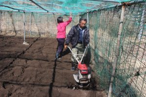 ◇4月からの農園活動の準備のために、農園サポーターの方々が6名来られました。耕運機で土を掘り起こし、石ころを拾った後に2種類の肥料をまき再び耕運機を動かしてしっかりと混ぜ込みました。農園はあっという間に畝を作れる状態になりました。寒い冬を越した土は、ふかふかのお布団のような状態になりました!4月の小中学生の畝作りから、5月のさつま芋の苗植え付けと作業が予定されています。